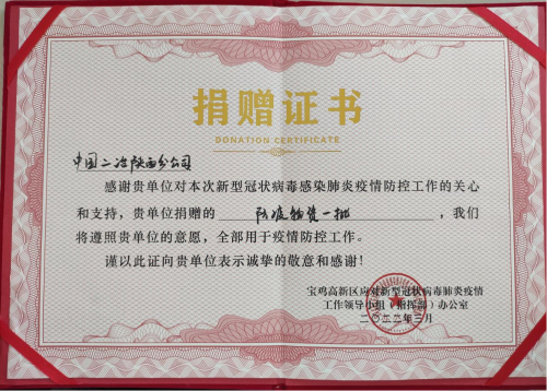 4月28日,中國二冶陜西分公司收到寶雞市高新區(qū)管委會捐贈證書,對中國二冶在寶雞市疫情防控關鍵階段提供的大力支持表示由衷的感謝。