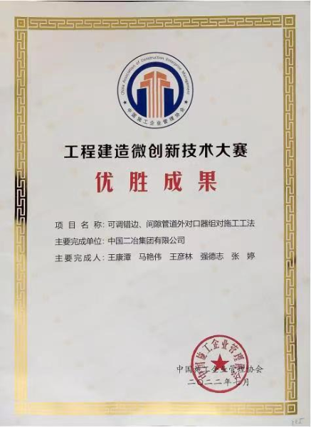 7月29日-30日,由中國施工企業(yè)管理協(xié)會(huì)主辦的2022年工程建設(shè)行業(yè)科技工作會(huì)議暨科技成果競(jìng)賽交流會(huì)在杭州召開。會(huì)上,由中國二冶選送的“可調(diào)錯(cuò)邊、間隙管道外對(duì)口器組對(duì)施工工法”榮獲第二屆工程建造微創(chuàng)新技術(shù)大賽優(yōu)勝成果獎(jiǎng);“大口徑長(zhǎng)輸管道大跨度整體吊裝施工方法”榮獲第二屆工程建設(shè)行業(yè)高推廣價(jià)值專利大賽三等獎(jiǎng)。