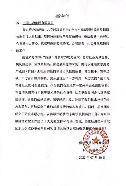 中國二冶收到廣東湛江經(jīng)濟技術開發(fā)區(qū)東山街道辦事處感謝信——感謝中國二冶助力湛江市疫情防控