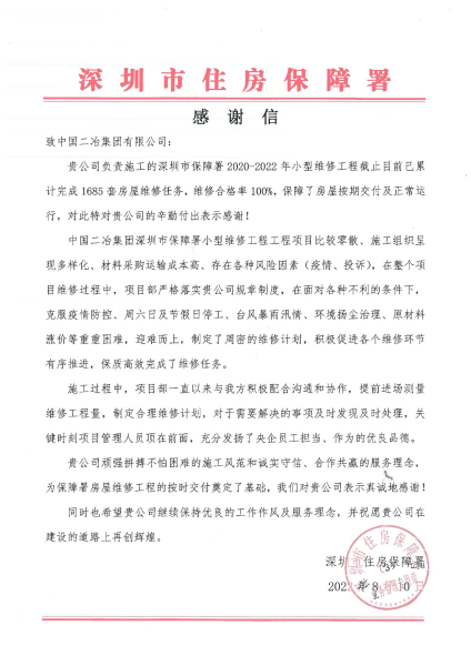 8月26日,深圳市住房保障署向中國二冶發(fā)來感謝信,高度贊揚中國二冶廣東分公司在深圳市保障署小型維修工程項目建設(shè)工作中,全面推行標準化管理和精細化施工,實干擔當、奮勇爭先,充分展現(xiàn)了頑強拼搏不怕困難的施工風范和誠實守信、合作共贏的服務(wù)理念。