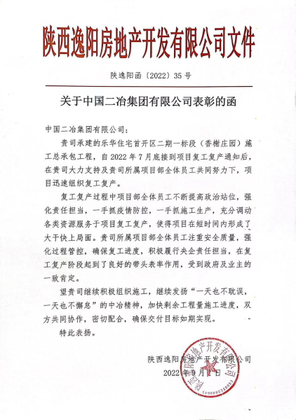 9月1日,中國二冶收到陜西逸陽房地產開發(fā)有限公司發(fā)來的《關于中國二冶集團有限公司表彰的函》。表彰函充分肯定了中國二冶陜西分公司在樂華住宅首開區(qū)二期一標段(香榭莊園)施工總承包項目復工復產以來展現(xiàn)出來的關鍵時刻頂?shù)米?,困難面前勇攀登的央企風范。